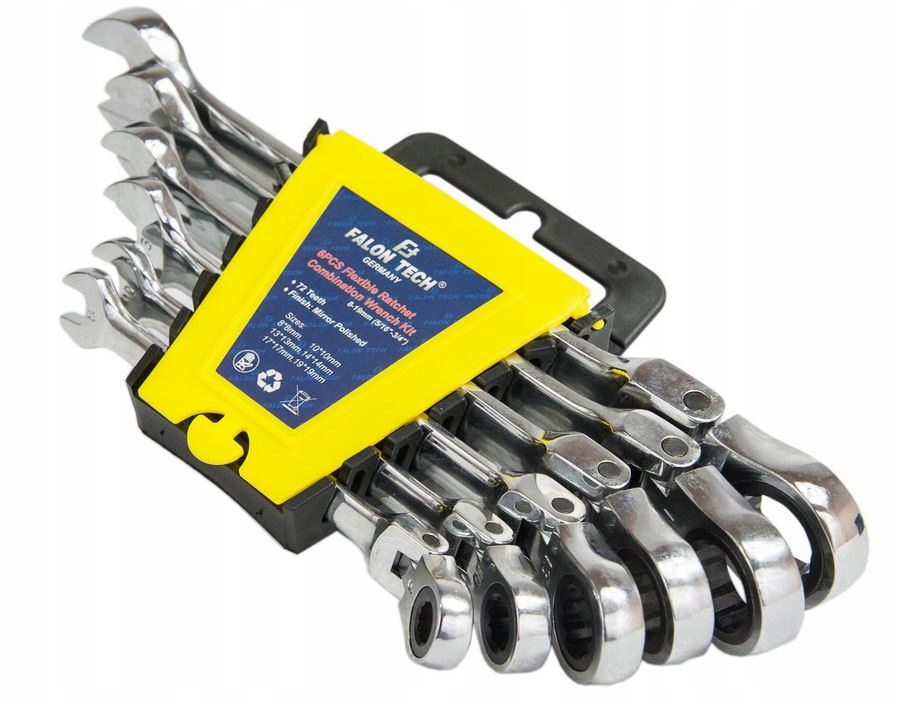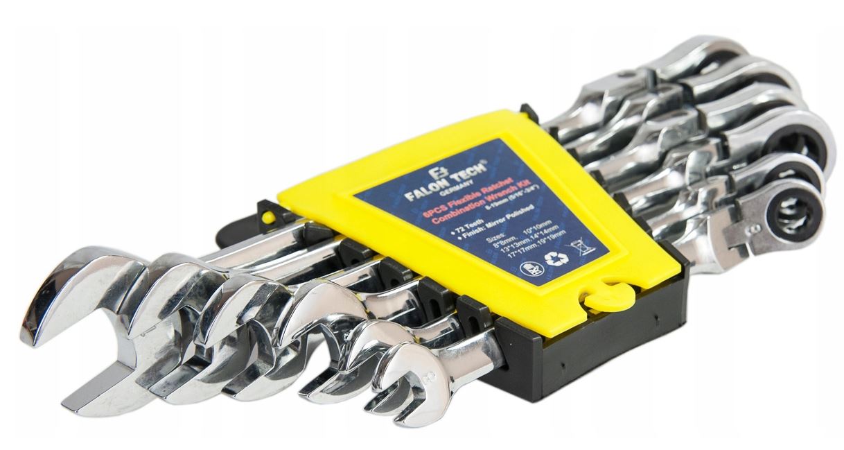 Набор комбинированных трещоточных ключей с шарниром 6 шт используется для обслуживания крепежных соединений. Ключ состоит из рожковой головки с одной стороны и трещотки на шарнире - с другой. Ключи изготовлены из высококачественной стали 40CrV1. Твердость материала храпового механизма ― 58 HRс. Инструмент имеет хромоникелевое антикоррозионное покрытие.